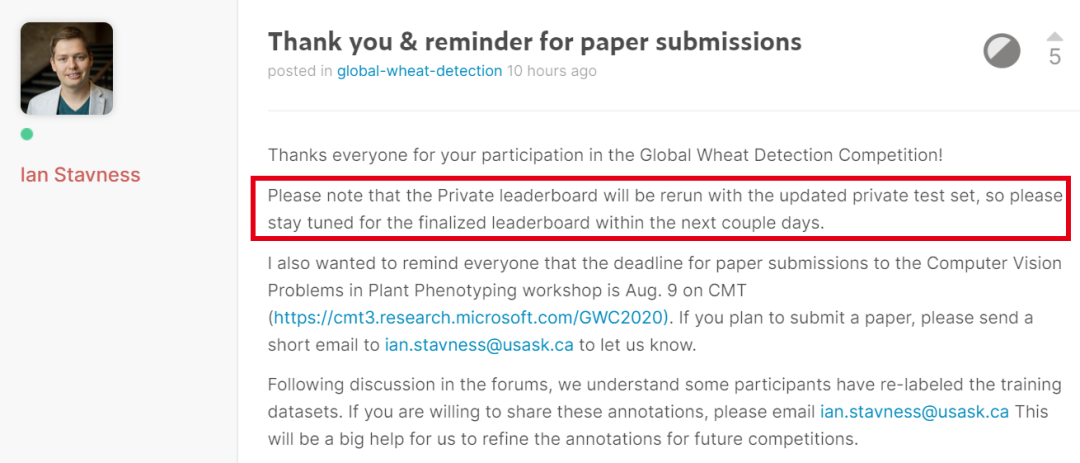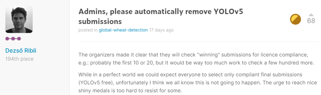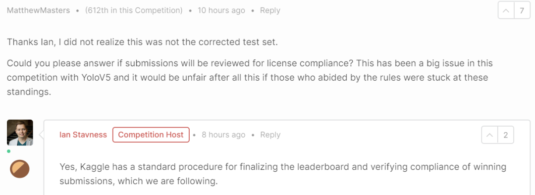 有些人在比赛中使用YOLOv5,那么对其他人是不公平的。虽然比赛结束了,但事件还是愈演愈烈,于是Kaggle 官方10个小时前发布帖子说: