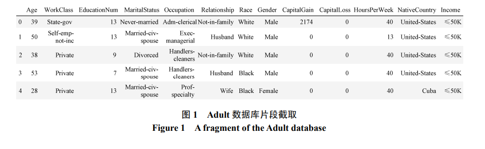 首先, 本文举例描述数据分析任务场景以及可 能存在的隐私威胁。图 1 为 Adult 公开数据库的片段 截取示例。在 Adult 数据库中, 每一行代表一条个人 (隐私)信息。数据分析者想要分析数据库中所包含的 模式规律。例如, 统计问题“数据库中有多少人的信 息满足属性P?”属性P可以是“年收入超过50K?” 或者“年龄超过 50 岁”, 或者两者的交集。机器学 习二分类任务可以是“基于个人的其他信息预测该 人的年收入是否超过 50K”。