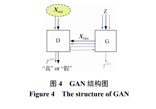 生成模型有多种, 本文专指对抗生成模型 GAN。GAN 有很强的分布模仿能力, 能够生成与原始训练集分 布近似的高纬度数据集。因此许多研究者用其当作天然 的规避隐私保护的方法, 生成并发布合成数据集, 并用 人工合成数据集替代隐私数据集发布使用。但是近年来 研究发现GAN本身并没有严格证明的隐私保护性能, 特 别的, 成员猜测攻击对GAN 也有攻击效果[40, 42-43, 45, 68]。根据第 3 节, 差分隐私机制能够抵抗成员猜测攻击, 因 此研究差分隐私的 GAN 对于隐私保护至关重要。GAN 基本知识: GAN 的基本结构如图 4 所示,