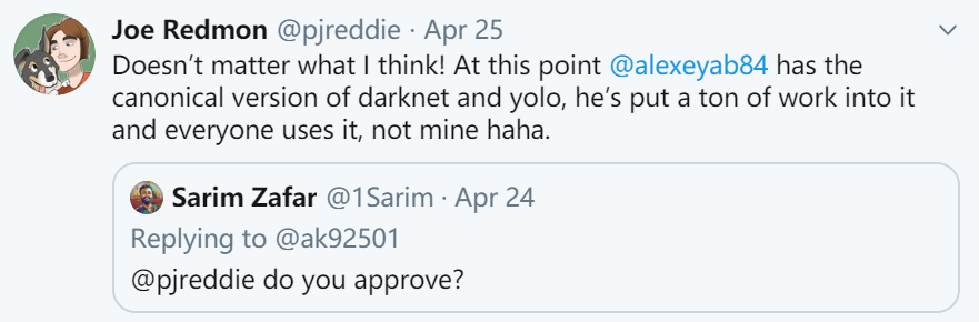 关于YOLOv4是否是YOLOv3的真正"继承者",我想没有人比Joe Redmon(YOLOv1-v3作者)回答更合适了,他在twitter上的回复内容如下: