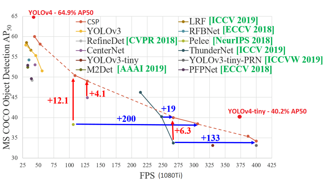 无论是AP,还是FPS的性能,其相较于YOLOv3-Tiny、Pelee、CSP都是巨大的提升,如下图所示: