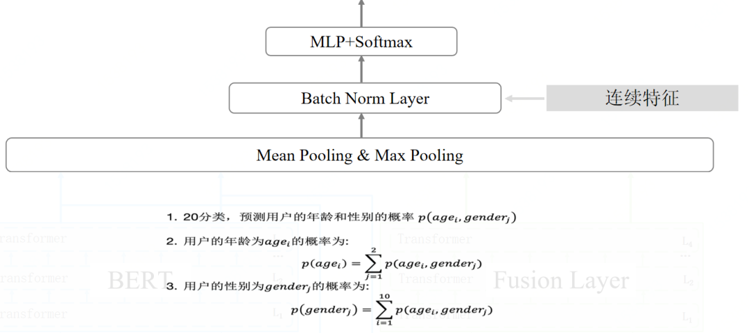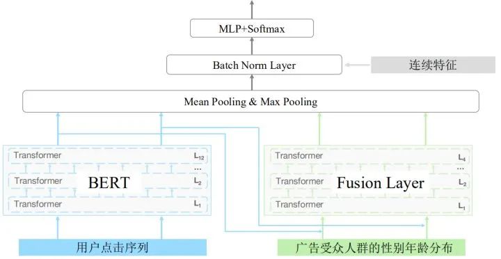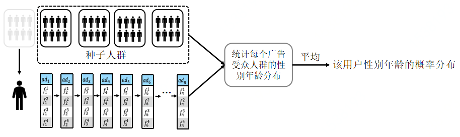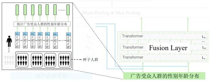 把点击广告的受众人群性别年龄分布融入到网络之中,具体的做法是把人群分为五个部分,假设用户点击n个广告并来自第一个人群,那么可以把剩下的作为种子人群,计算出每个广告的性别年龄概率分布,用四层的transformer进行融合。