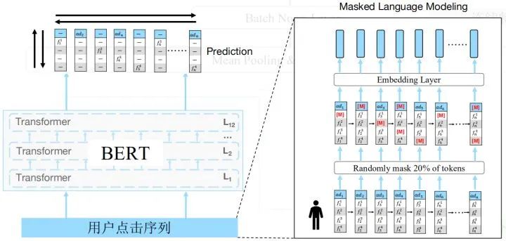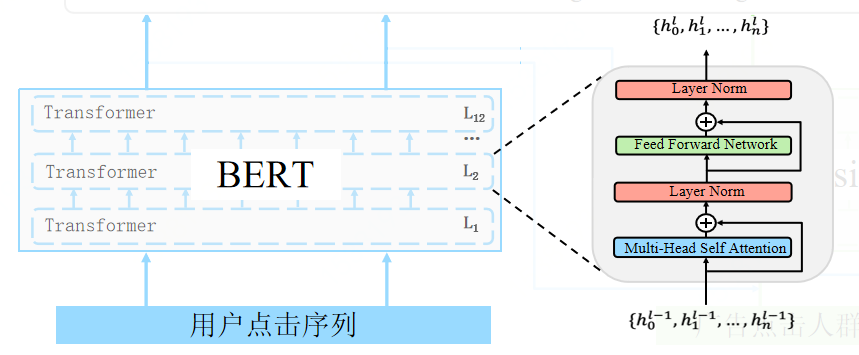 首先是bert部分,假设每个广告为一个单词,将用户点击序列看作一句话,这样就将问题转为了NLP的文本分类问题。我们使用bert作为我们的encoder进行编码,这里我们使用了12层transformer。每层transoformer将上一层的隐变量作为输入,经过Multi-Head Self Attention和Layer Norm等,最后输出交互更高的隐变量。