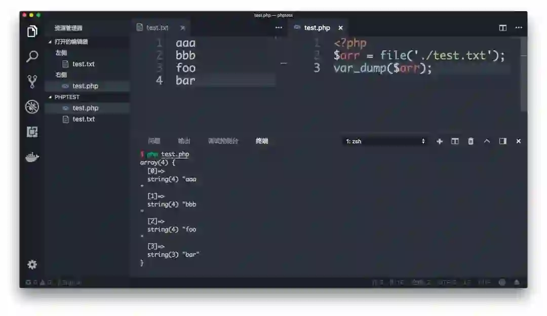 也就是说这种方法默认分割后的数组每个数据是包含最后的那个换行符的!想要去掉换行符需要添加 FILE_IGNORE_NEW_LINES 的标记参数。我自己也试了下发现果真如此!可以看到数组的前三个里面字符串的长度都是 4。