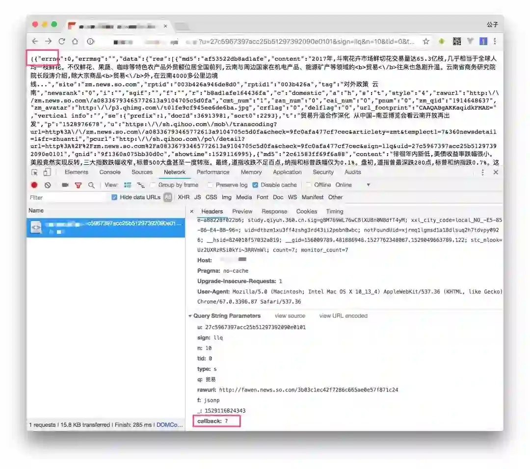 我们都知道 JSONP 需要定义一个 callback 回调名称,最后数据加载的时候执行这个回调返回数据才算成功。可以看到图里面虽然加了 callback=? 但是并没有对 ? 进行替换,服务端那边应该也是增加了校验这种情况下并没有给我们添加回调方法名。实际上服务端这里的处理都是没问题的,因为即使 ? 被添加到数据里了也会有问题,因为 ? 是逻辑运算符并不能被定义成变量。而没有加回调方法的后果就是虽然接口返回正常,但是最终数据没有人接收就“野”了。
