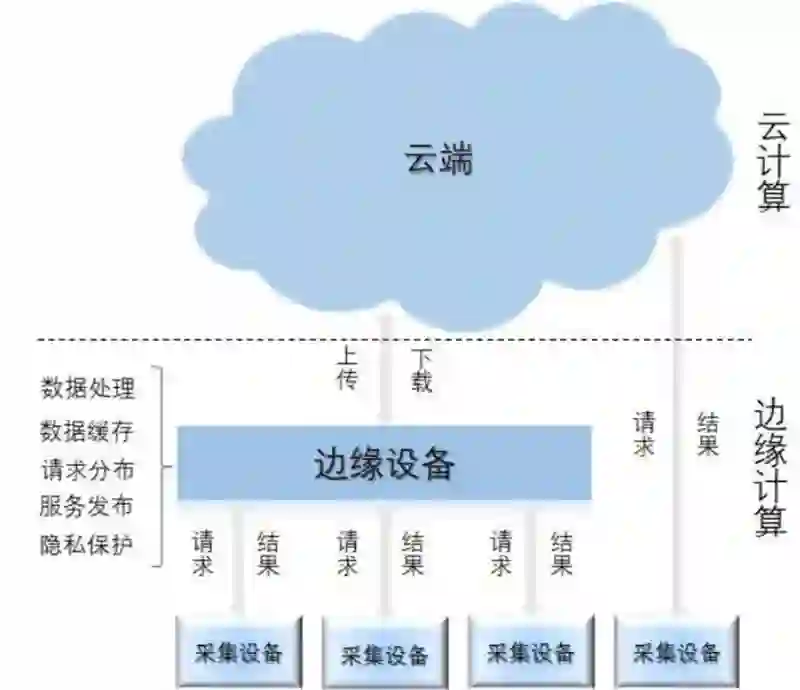 以物联网场景举例。物联网中的设备产生大量的数据,数据都上传到云端进行处理, 会对云端造成巨大的压力, 为分担中心云节点的压力,边缘计算节点可以负责自己范围内的数据计算和存储工作。同时, 大多数的数据并不是一次性数据, 那些经过处理的数据仍需要从边缘节点汇聚集中到中心云, 云计算做大数据分析挖掘、数据共享,同时进行算法模型的训练和升级,升级后的算法推送到前端,使前端设备更新和升级,完成自主学习闭环。同时,这些数据也有备份的需要,当边缘计算过程中出现意外情况,存储在云端的数据也不会丢失。