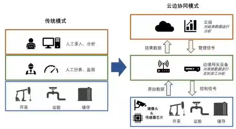 以石油行业为例,在油气开采、运输、储存等各个关键环节,均会产生大量的生产数据。在传统模式下,需要大量的人力通过人工抄表的方式定期对数据进行收集,并且对设备进行监控检查,以预防安全事故的发生。抄表员定期将收集的数据进行上报,再由数据员对数据进行人工的录入和分析,一来人工成本非常高,二来数据分析效率低、时延大,并且不能实时掌握各关键设备的状态,无法提前预见安全事件防范事故。而边缘计算节点的加入,则可以通过温度、湿度、压力传感器芯片以及具备联网功能的摄像头等设备,实现对油气开采关键环节关键设备的实时自动化数据收集和安全监控,将实时采集的原始数据首先汇集至边缘计算节点中进行初步计算分析,对特定设备的健康状况进行监测并进行相关的控制。此时需要与云端交互的数据仅为经过加工分析后的高价值数据,一方面极大的节省了网络带宽资源,另一方面也为云端后续进一步大数据分析、数据挖掘提供了数据预加工服务,为云端规避了多种采集设备带来的多源异构数据问题。