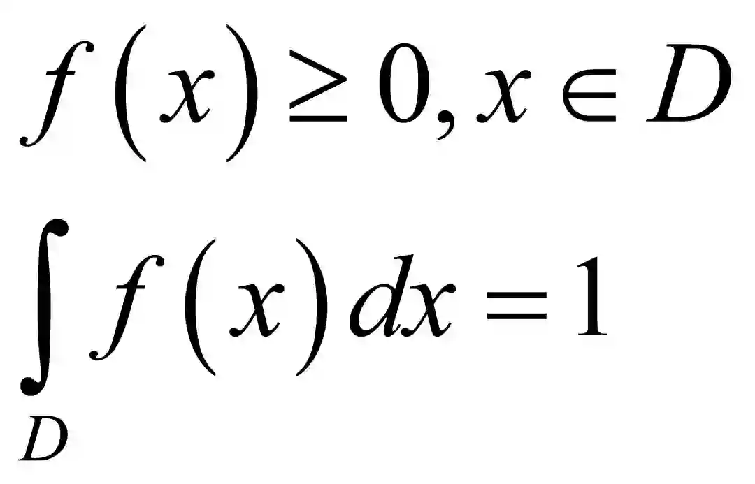 在概率统计中,概率密度函数f(x)满足非负性和规范性,即函数值非负并且全域积分为1。