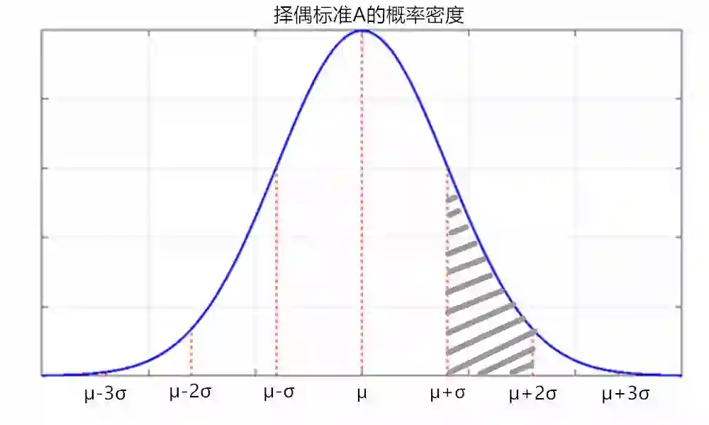 如果你的择偶要求(眼光)较高,意味着你对于择偶条件A的接受范围大概位于(μ+σ,μ+2σ)的区间(图中阴影部分):