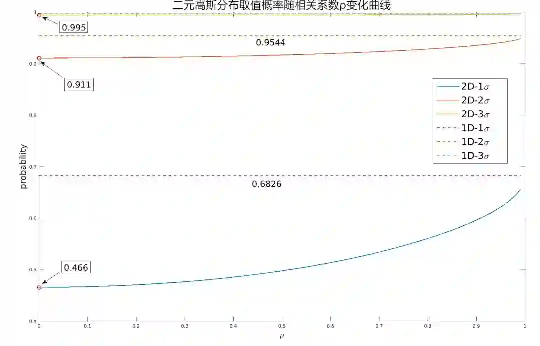 图1中,横坐标是变量X和Y的相关系数ρ,纵坐标是概率。2D-1σ(蓝线)表示X和Y都落在各自的1σ区域,即x∈(μ1-σ1,μ1+σ1)且 y∈(μ2-σ2,μ2+σ2)的概率;1D-1σ(紫虚线)表示一元高斯变量的值落在1σ区间内概率,即上文提到的0.6826。