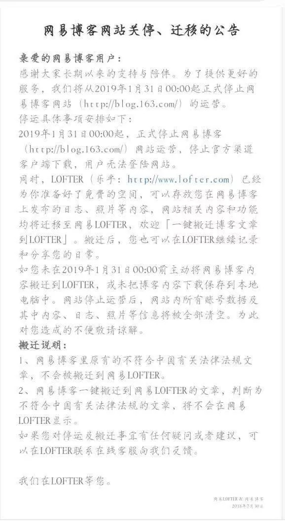 网易博客公告表示,将于2018年11月30日00:00起正式停止网易博客运营。停运具体事项安排为,2019年1月31日00:00起,正式停止网易博客网站运营,停止官方渠道客户端下载,用户无法登陆网站。并表示可以将日志内容一键搬迁至网易旗下轻博客品牌Lofter(乐乎)。