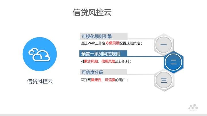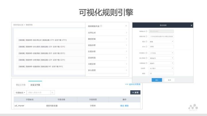 1)信贷风控云,包含了一系列基于海量样本、模型评分与专家经验制定的预置风控规则,客户可以直接选择其中的部分或者全部使用。信贷风控云也提供了一个可视化的规则引擎,该规则引擎集成数美所有的风控数据,并支持客户自定义的风控数据。客户可以利用这些数据,在web控制台灵活地配置各种风控规则策略。
