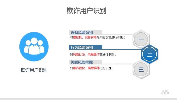欺诈用户识别主要应用于业务流程的设备启动与注册环节,分为设备风险识别、行为风险识别、关联风险识别。