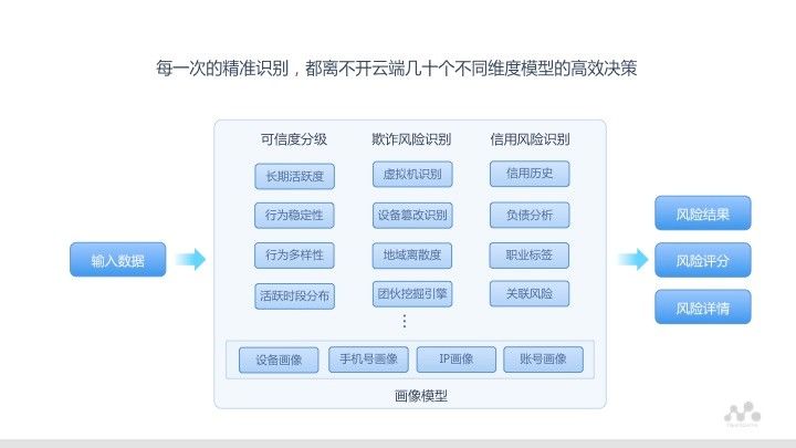 每一次的精准识别,都离不开云端几十个不同维度模型的高效决策。从基础硬件的信息搜集,到数万特征的比对分析,再到汇总高级引擎,全方位智能决策让可信度分级、欺诈风险识别、信用风险评估更加精准。