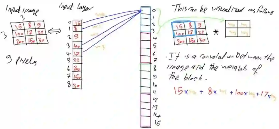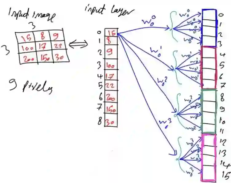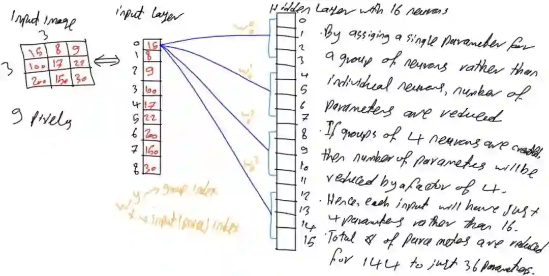 之前所述内容使得每个神经元接受所有像素,若存在接受4个输入的函数f(x1,x2,x3,x4),则这意味着要基于所有这4个输入来进行决定。如果只有2个输入,但其输出结果与使用4个输入的结果相同,那么将不必使用所有的这4个输入,只需给出对结果有影响的2个输入即可。借鉴该思想,每个神经元接受输入的9个像素,若能使用更少的像素获得相同或更好的结果就大大降低了参数数量,因此可以朝着这个方向优化网络参数。