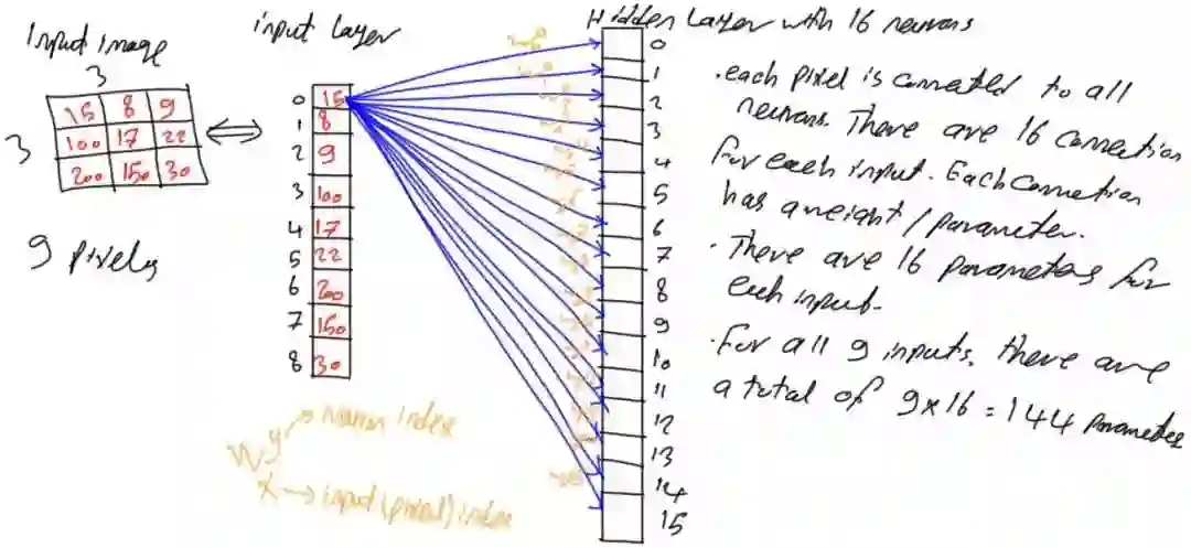由于网络是全连接网络,这意味着第i层的每个神经元与第i-1层中的所有神经元相连。即隐藏层中的每个神经元都与输入层中9个神经元相连。换句话说,每个输入像素与隐藏层中的16个神经元相连,其中每条连接都具有相应的参数(权重)。通过将每个像素与隐藏层中的所有神经元相连,如图4所示,该网络具有9x16=144个参数(权重)。