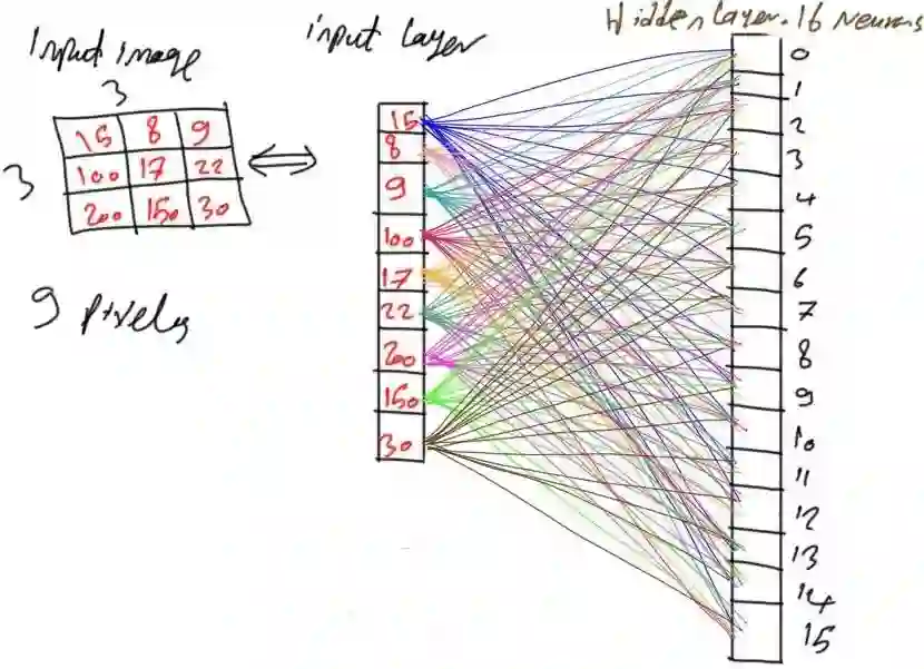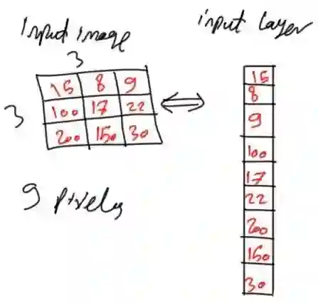 每个像素被映射为向量元素,向量中的每个元素又代表ANN中的神经元。由于图像有3x3=9个像素点,那么输入层(Input Layer)将有9个神经元。由于ANN结构通常水平延伸,因此每层被表示为列向量。