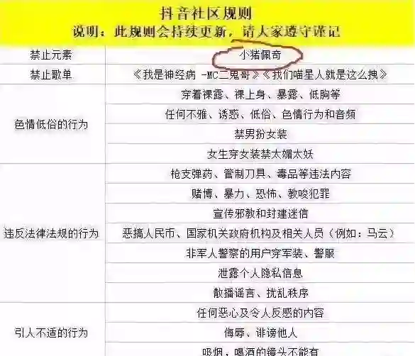 有知乎网友爆料称,抖音更新社区规则,部分元素、歌单、色情低俗、水印、LOGO等内容,将被禁止。在这份曝光的“抖音社区规则列表”中,“小猪佩奇”赫然在列,十分醒目。