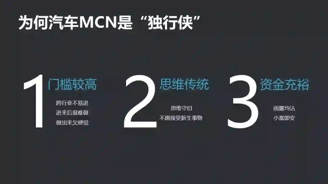 接下来进入到今天分享的主题。为什么汽车MCN是“独行侠”?我想说几个特点
