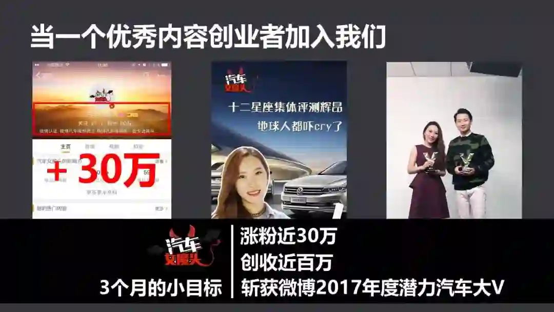 我举个例子。我们投资了一家IP,叫汽车女魔头,之前叫金戈话铁马,是papitube旗下的。papitube是一家非常有实力的MCN,是幽默搞笑型的,所以它对专业领域的粉丝也好,商业化而言也好,其实速度并不是特别快。当这个IP加入到我们之后,他的粉丝增长了30万。同时在一个阶段内,有了大概100万左右的营收,同时还拿到了新浪影响力峰会的奖。