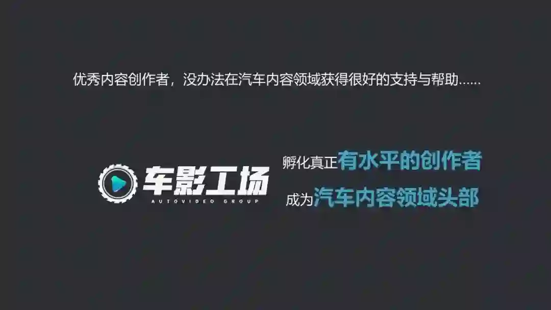 虽然我们有很多困难,面前有各种各样的门槛,但作为一个优秀的内容创作者,我们总希望大家可以进入到汽车行业,帮助这个行业做出更多的内容。我们也帮助这些有想法,有内容能力的人获得成功。我们车影工场的初心就是帮助真正有水平的创作者成为汽车内容领域的头部。