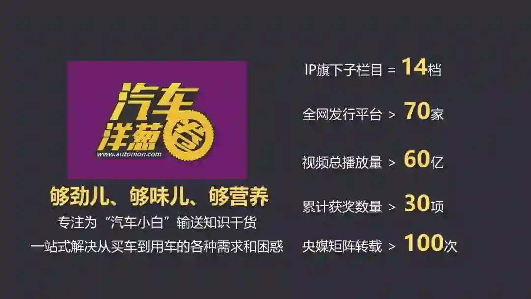 首先介绍一下,我们这家公司的第一个IP叫汽车洋葱圈。它是一档针对小白用户,专注于他们买车、用车,一站式的知识型的节目。我们刚刚创立这个节目的时候,其实做的是降级创业。因为我们团队都是经验非常丰富,来自专业网站和视频网站的人,做这个节目非常容易。