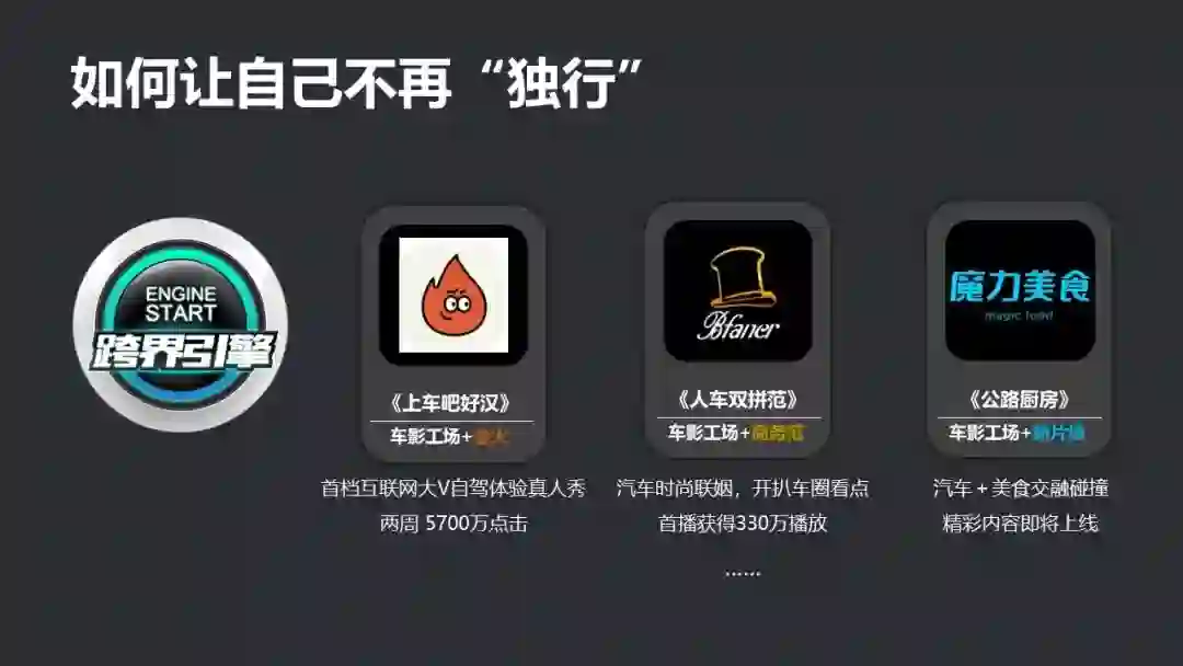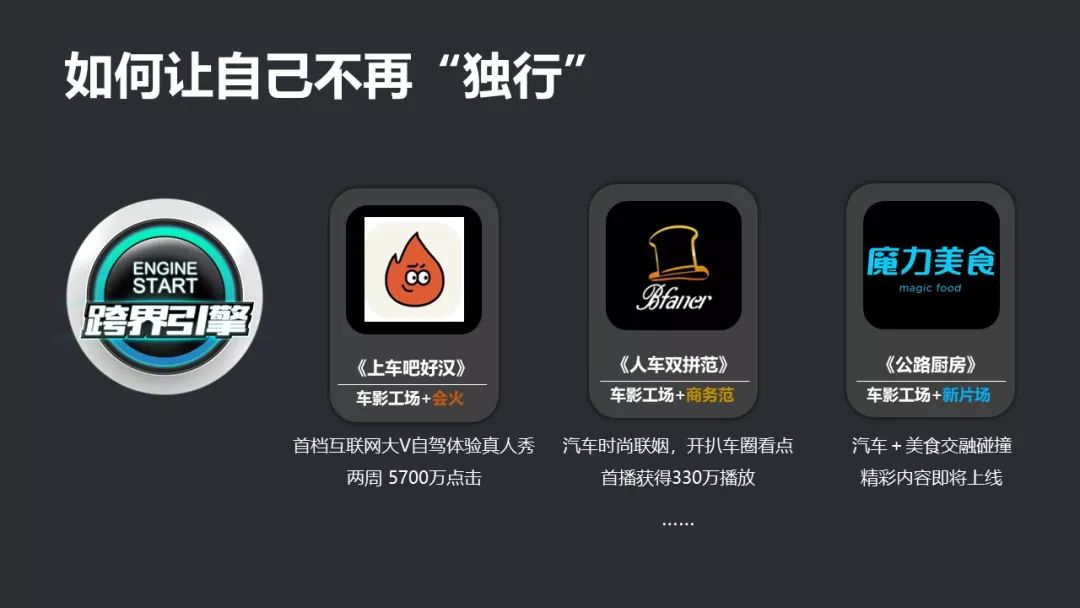 我们汽车行业是非常闭塞的,那么在未来,我们如何不再让自己独行呢?我们在2018年推出了一个新产品叫“跨界引擎”,帮汽车行业和其他行业进行打通。我们之前跟“关爱八卦成长协会”联合出品了一档节目,叫《上车吧好汉》。这是汽车行业具有开创性的节目,在第一季的播放量超过5700万。