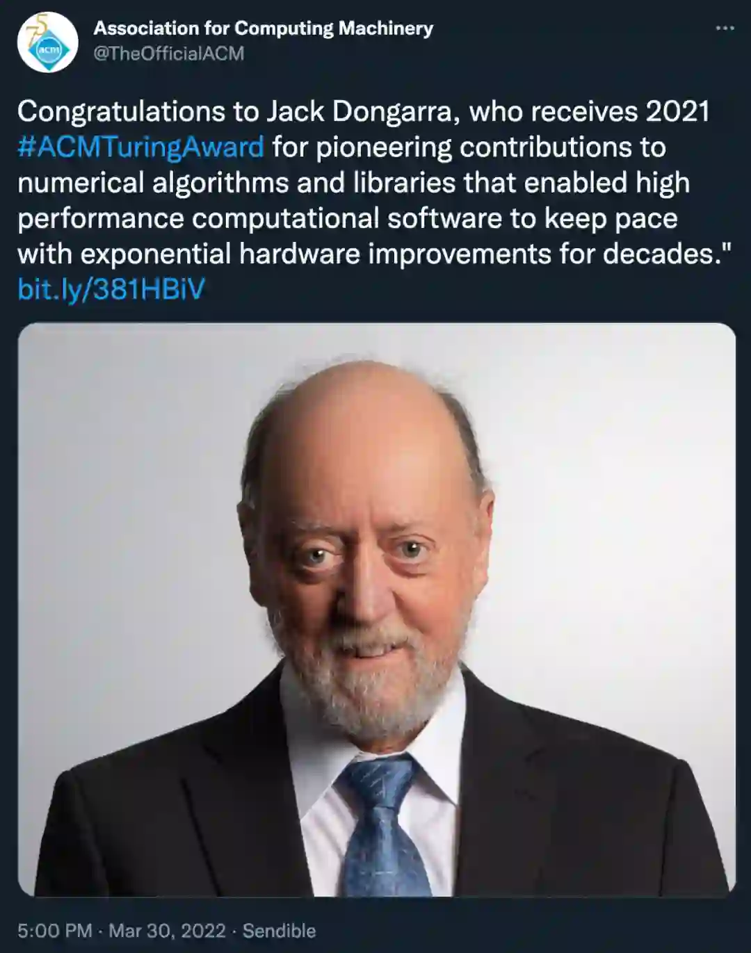 谷歌高级研究员、谷歌研究 & 谷歌健康高级副总裁 Jeff Dean 表示:「Jack Dongarra 的工作从根本上改变并推动了科学计算的发展。他在世界上各个科学计算领域使用最频繁的数值软件库上的核心工作,帮助推进了从药物发现、天气预报到航空航天工程等十几个领域。他专注于表征广泛的计算机带来了适配数值计算的计算机体系结构的重大进步。」