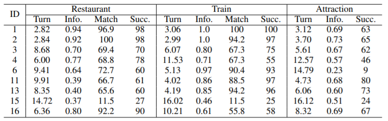 任务成功率:用Inform F1和匹配率衡量,其中informf1评估所有信息请求是否得到满足,匹配率评估所提供的实体是否满足用户目标中指定的所有约束。当且仅当Inform F1和匹配率均为1时,对话框才会标记为成功。