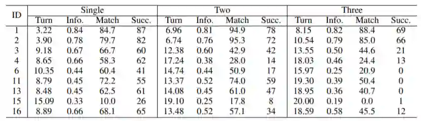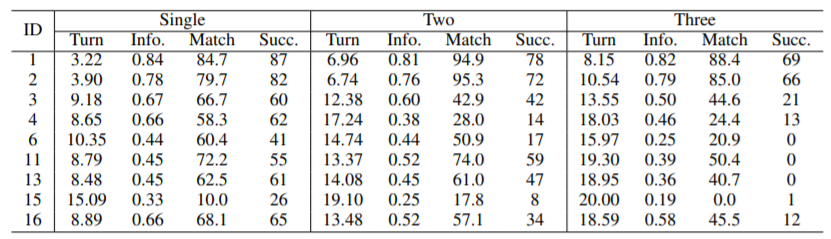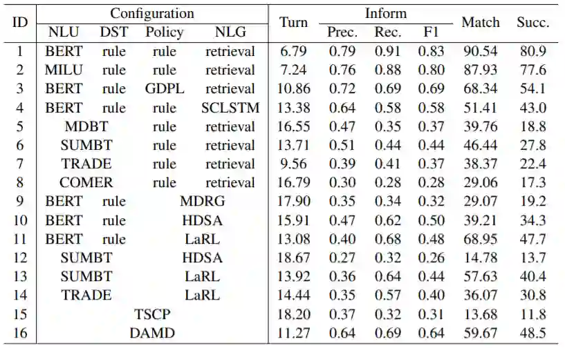 此外,模块内的评价基本只是在单论对话的设定下进行,而一个完整的对话应当由系统和用户进行多轮交互达成的。故在论文中,作者尝试比较了不同模块、不同细粒度、不同配置下各个目标导向型对话系统,以作系统级的性能评估。搭建完的对话系统通过与模拟用户或真实用户进行多轮对话交互,并使用对话级别的评价指标进行实验。