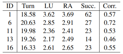 表5显示了5个对话系统的人工评估结果。与表1中的模拟评估相比,可以看到大多数系统的Pearson相关系数都在0.5到0.6之间,这表明模拟评估与人类评估的相关性中等。