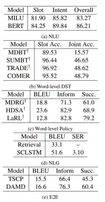 表2:每个模块的组件性能。†表示来自MultiWOZ排行榜的结果。其中,NLG为:自然语言生成模块从对话行为表示生成自然语言响应。E2E为:端到端模型将用户的话语作为输入,直接以自然语言输出系统响应。