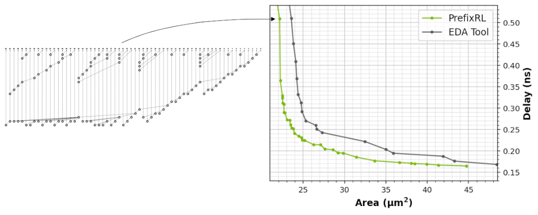 结果显示,在相同延迟、效能下PrefixRL加法器面积比EDA工具加法器面积减少了25%。