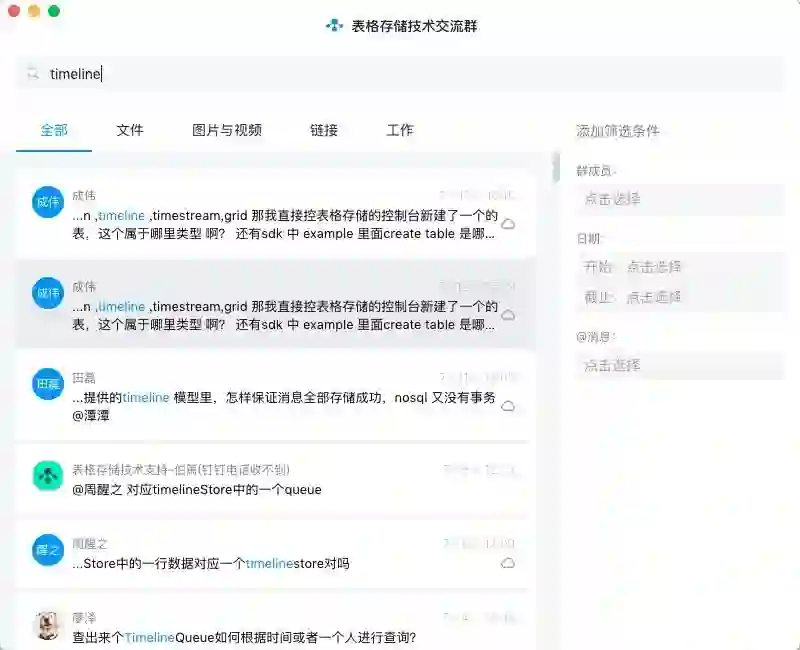 另外,为了做消息的权限管理,仅允许用户检索自己有权限查看的消息,可在消息体字段中扩展接收人ID数组,这样对所有群做检索时,需要增加接收人字段为自己的用户ID这一必要条件,即可实现消息内容的权限限制。样例中没有实现这一功能,用户可根据需求自己增加、修改。
