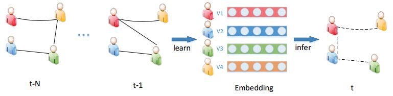 如何对大数据网络的演变进行分析,是大数据背景下的一个研究热点。颜永红课题组提供了一个新的思路:对大网络及超大网络的节点根据历史连接信息进行学习表示,将节点信息压缩成一个低维度的向量,并将习得的向量用于预测网络未来的连接走向。模型的学习和预测过程如图1。