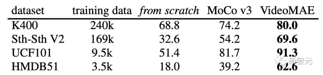 1. Action Recognition on Something-Something V2 https://paperswithcode.com/sota/action-recognition-in-videos-on-something?p=videomae-masked-autoencoders-are-data-12. Action Detection on AVA v2.2 https://paperswithcode.com/sota/action-recognition-on-ava-v2-2?p=videomae-masked-autoencoders-are-data-13. Action Classification on Kinetics-400 https://paperswithcode.com/sota/action-classification-on-kinetics-400?tag_filter=1634. Self-Supervised Action Recognition on UCF101 https://paperswithcode.com/sota/self-supervised-action-recognition-on-ucf101?tag_filter=1635. Self-Supervised Action Recognition on HMDB51 https://paperswithcode.com/sota/self-supervised-action-recognition-on-hmdb51?tag_filter=163