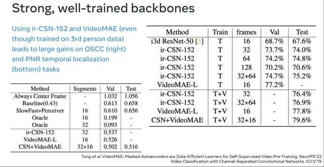 https://huggingface.co/docs/transformers/main/en/model_doc/videomae几个月前,VideoMAE的模型被Hugging Face的Transformers官方仓库收录,是该仓库收录的第一个视频理解模型!一定程度上也反应了社区对我们工作的认可!希望我们的工作能为基于Transformer的视频预训练提供一个简单高效的基线方法,同时也能为后续基于Transformer的视频理解方法带来启发。https://github.com/open-mmlab/mmaction2/tree/dev-1.x/configs/recognition/videomae目前视频理解仓库MMAction2也支持了对VideoMAE模型的推理。在刚刚结束的 ECCV 2022 2nd International Ego4D Workshop上,VideoMAE已经迅速成为了帮助大家打比赛的利器。上海人工智能实验室在本届Ego4D Challenge中的多个子赛道取得了冠军 。其中,VideoMAE作为重要的Backbone,为他们的解决方案提供了强大的视频特征。值得注意的一点是,从上面第一张图中可以发现,仅仅在Kinetics-400上进行预训练的VideoMAE(ViT-L)的效果已经可以超越在IG-65M视频数据集(约为Kinetics-400样本数据的300倍)上预训练的ir-CSN-152。这也进一步验证了VideoMAE预训练模型的强大表征能力。