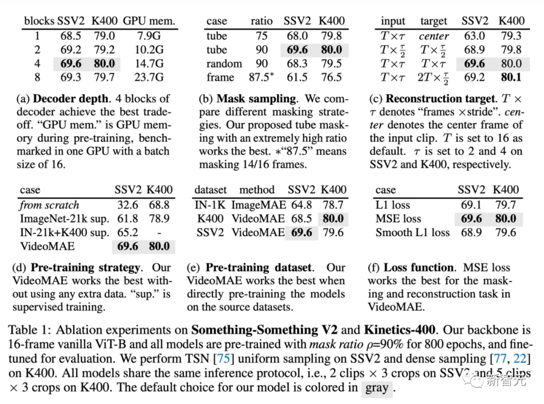 AVA v2.2数据集实验结果除了传统的动作分类任务,我们还进一步在视频动作检测这种更精细的理解任务上验证VideoMAE模型的表征能力。我们选取了AVA v2.2数据集进行实验。实验中,首先会加载Kinetics-400数据集上预训练好的模型,再对ViT进行有监督形式的微调。由表格可以发现,经过VideoMAE预训练的ViT模型可以在AVA v2.2数据集上取得非常好的结果。如果将自监督预训练后的ViT模型,在Kinetics-400上进行进一步的有监督的微调,可以在动作检测任务上去得更好的表现(3 mAP-6mAP的提升)。这也说明了对VideoMAE自监督预训练后的模型,在上游数据集进行有监督的微调后再迁移到下游任务中,模型的性能可以进一步提升。