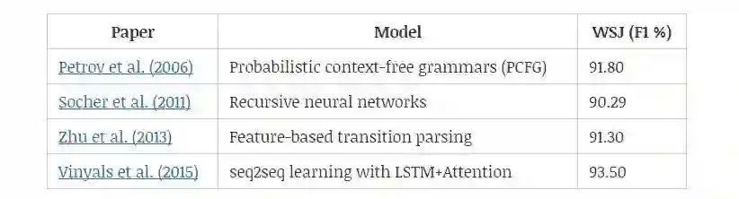 基于变换的模型也被应用于成分句法分析。Zhu 等人(2013)基于堆栈和缓冲器顶部几个单词的特征(如词性标签、成分标签)来进行每个转换动作。通过用线性标签序列表示解析树,Vinyals 等人(2015)将 seq2seq 学习方法应用于该问题。