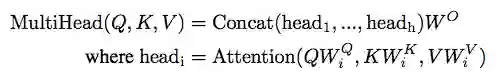 Transformer 的编码器和解码器部分都有一些堆叠层。每个层有两个由 multi-head 注意力层组成的子层(图 17),之后是 position-wise 前馈网络。对于查询集 Q、关键 K 和值 V,multi-head 注意力模块执行注意力 h 次,计算公式如下: