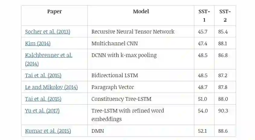 Socher 等人(2013)和 Tai 等人(2015)都是通过成分解析树及递归神经网络来改善语义表征。另一方面,树形 LSTM(tree-LSTM)比线性双向 LSTM 表现更好,说明树结构能够更好地捕捉自然句子的句法特性。Yu 等人(2017)提出用情感词汇微调预训练的词嵌入,然后基于 Tai 等人(2015)的研究观察改进结果。