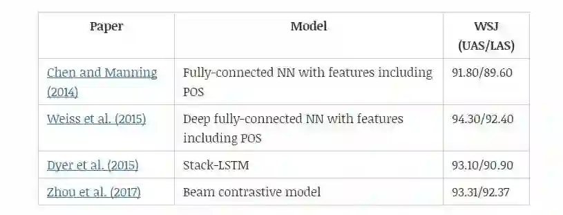 Tu 等人(2015)扩展了 Chen and Manning 的工作,他们用了带有两个隐藏层的深度模型。但是,不管是 Tu 等人还是 Chen 和 Manning,他们都依赖于从解析器状态中选择手动特征,而且他们只考虑了少数最后的几个 token。Dyer 等人(2015)提出堆栈-LSTMs 来建模任意长度的 token 序列。当我们对树节点的堆栈进行 push 或 pop 时,堆栈的结束指针(end pointer)会改变位置。Zhou 等人(2017)整合集束搜索和对比学习,以实现更好的优化。