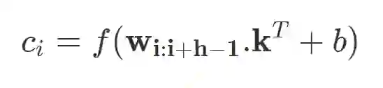 若令 w_i:i+j 表示 w_i, w_i+1,...w_j 向量的拼接,那么卷积就可以直接在这个词嵌入输入层做运算。卷积包含 d 个通道的卷积核 k∈R^hd,它可以应用到窗口为 h 个词的序列上,并生成新的特征。例如,c_i 即使用卷积核在词嵌入矩阵上得到的激活结果: