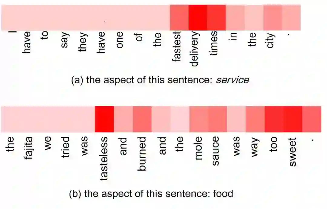 图 16:对于特定 aspect,注意力模块对句子的关注点(图源:https://aclanthology.coli.uni-saarland.de/papers/D16-1058/d16-1058)