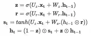 另一个门控 RNN 变体是 GRU,复杂度更小,其在大部分任务中的实验性能与 LSTM 类似。GRU 包括两个门:重置门和更新门,并像没有记忆单元的 LSTM 那样处理信息流。因此,GRU 不加控制地暴露出所有的隐藏内容。由于 GRU 的复杂度较低,它比 LSTM 更加高效。其工作原理如下: