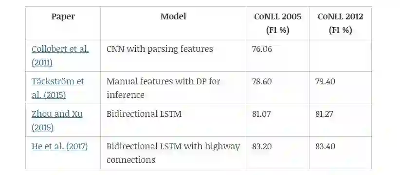 给定一个谓词,Täckström 等人(2015)基于解析树,通过一系列特征对该谓词的组成范围以及该范围与该谓词的可能关系进行打分。他们提出了一个动态规划算法进行有效推断。Collobert 等人(2011)通过解析以附加查找表形式提供的信息,并用卷积神经网络实现了类似的结果。Zhou 和 Xu(2015)提出用双向 LSTM 来建模任意长度的上下文,结果发现不使用任何解析树的信息也是成功的。