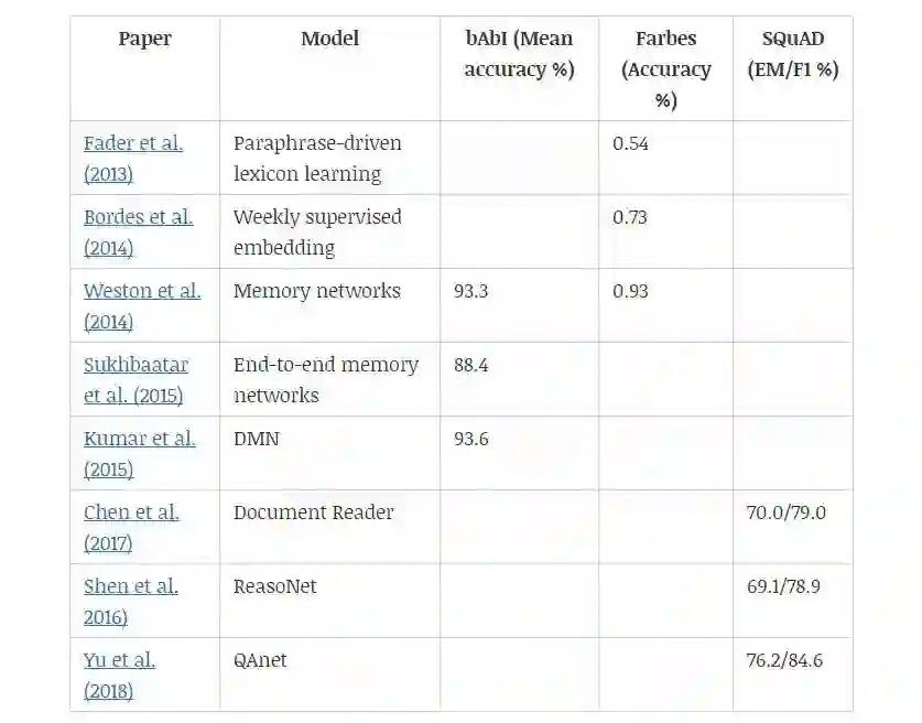 QA 问题有多种形式,有的研究者根据大型知识库来回答开放性问题,也有的研究者根据模型对句子或段落的理解回答问题。对于基于知识库的问答系统,学习回答单关系查询的核心是数据库中找到支持的事实。