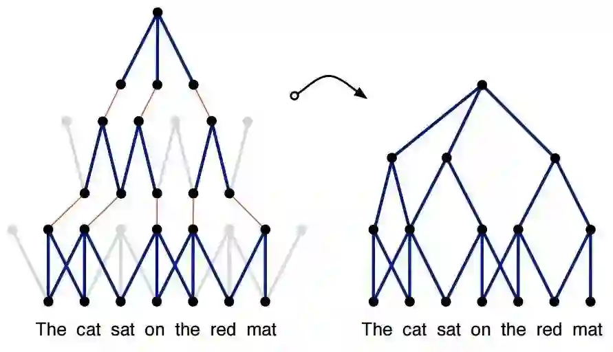 Kalchbrenner 等人的研究在一定程度上解决了上述问题。他们发表了一篇著名的论文,提出了一种用于句子语义建模的动态卷积神经网络(DCNN)。他们提出了动态 k-max 池化策略,即给定一个序列 p,选择 k 种最有效的特征。选择时保留特征的顺序,但对其特定位置不敏感。在 TDNN 的基础上,他们增加了动态 k-max 池化策略来创建句子模型。这种结合使得具有较小宽度的滤波器能跨越输入句子的长范围,从而在整个句子中积累重要信息。在下图中,高阶特征具有高度可变的范围,可能是较短且集中,或者整体的,和输入句子一样长。他们将模型应用到多种任务中,包括情感预测和问题类型分类等,取得了显著的成果。总的来说,这项工作在尝试为上下文语义建模的同时,对单个内核的范围进行了注释,并提出了一种扩展其范围的方法。