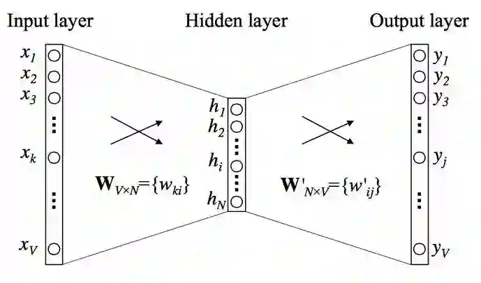 如图 4 所示,CBOW 模型就是一个简单的全连接神经网络,它只有一个隐藏层。输入层是上下文词的 one-hot 向量,它有 V 个神经元(词汇量),而中间的隐藏层只有 N 个神经元,N 是要远远小于 V 的。最后的输出层是所有词上的一个 Softmax 函数。层级之间的权重矩阵分别是 V*N 阶的 W 和 N*V 阶的 W',词汇表中的每一个词最终会表征为两个向量:v_c 和 v_w,它们分别对应上下文词表征和目标词表征。若输入的是词表中第 k 个词,那么我们有: