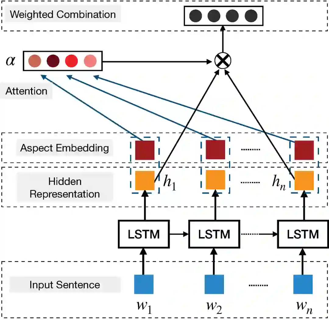 图 15:使用注意力机制进行 aspect 分类(图源:https://aclanthology.coli.uni-saarland.de/papers/D16-1058/d16-1058)